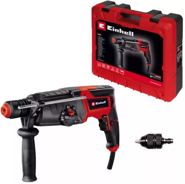 Az Einhell TE-RH 950 5F fúrókalapács egy multifunkciós szerszám, amely nélkülözhetetlen segítőtársa lesz a garázsban és a műhelyben egyaránt. A fúrókalapács öt különböző funkciót egyesít magában: használja fúráshoz, kalapácsfúráshoz, valamint véséshez, vésőrögzítéssel vagy rögzítés nélkül – a nagy teljesítményű készüléknek egyik feladat elvégzése sem jelenthet gondot. A kétfokozatú hajtóművet úgy tervezték, hogy még a kemény anyagok megmunkálása se jelenthessen gondot: az első fokozat nagy nyomatékot, a második pedig magas fordulatszámot biztosít. A 950 W teljesítménynek köszönhetően a fúrókalapács könnyedén megbirkózik olyan anyagokkal, mint a kő, fa vagy fém. Fúrásteljesítmény beton megmunkálásakor: max. 28 mm. A pneumatikus ütőszerkezet könnyedén megbirkózik a legkülönfélébb anyagokkal is. Az üzemmódok között a funkcióválasztó gomb segítségével válthat. A kényelmes és biztos tartást a nagy Softgrip felületek biztosítják. A rögzíthető nyomógomb kényelmes munkavégzést tesz lehetővé. Robusztus félautomata SDS-Plus tokmánnyal, ami gyors és egyszerű szerszámcserét tesz lehetővé, illetve, keményfémből készült, fokozatmentesen állítható furatmélység-ütközővel. A tartalék tokmányt csavarozásra és fúrásra tervezték. Tárolásra és szállításra tervezett E-Box kofferben.