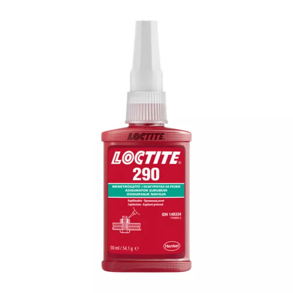 A LOCTITE® 290 egy folyékony, közepes / nagy szilárdságú csavarrögzítő a menetek rögzítésére és tömítésére. A termék Igen kis viszkozitású, kapilláraktív tulajdonságú, ezért behatol a már összeszerelt menetek közé, így nem kell azokat szétszerelni a termék felviteléhez. A termék a szorosan kapcsolódó fém menetek között - a levegő kizárásával, anaerob módon - megköt, így megakadályozva a vibráció és a rázkódás által okozott lazulást. Egyidejűleg tömíti is a meneteket. A termék alkalmas öntvények, hegesztési varratok, porózus fémek porozitásának kitöltésére is.