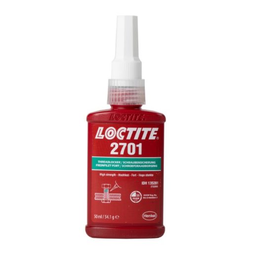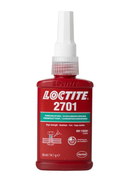 A LOCTITE® 2701 nagy szilárdságú, kis viszkozitású, zöld színű, metakrilát bázisú csavarrögzítő termék. Kiváló krómozott felületekre. Jellemző rögzítési idők 10, 4 és 25 perc acélon, sárgarézen és rozsdamentes acélon. Ipari olajokkal enyhén szennyezetett felületeken is alkalmazható. UV fénnyel megvilágítva fluoreszkál.
