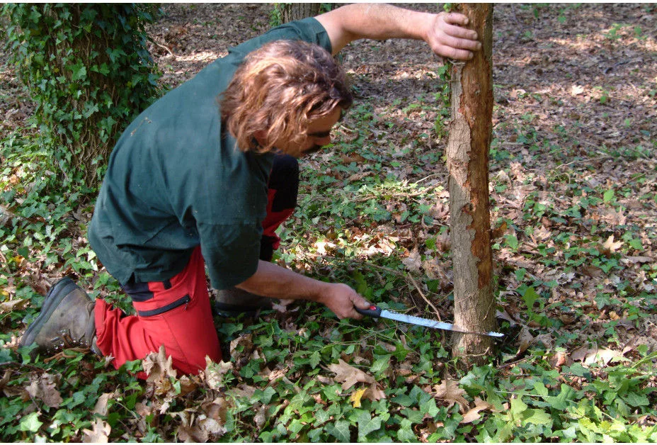A Gomtaro metszőfűrész elengedhetetlen része a berendezésének, és a felhasználó első választása a formatív metszéshez a fa növekedésének korai éveiben. Az egyenes penge még tisztább és pontosabb vágást ad, mint egy ívelt penge. A sima favágás, amelyet ez a húzófűrész hagy maga után, könnyen megnő. A fa hálás lesz! Az egyenes penge könnyebben kezelhető szűk helyeken és a talaj közelében. A Gomtaro-t szakképzett arboristák körében ajánlják, amikor eltávolítják a fa koronáját. Vágási vágáshoz az egyenes penge segíti a pántfa kezelését, miközben megtartja az egyenes hátsó vágást. Ha először használja a Selymet, akkor vegye figyelembe ezt a borotvaéles fűrészt! A famászás fizikai gyakorlása fűrészt igényel, amely megkönnyíti a metszést. Joggal, a szakemberek a Selymet választják kézifűrészként. A fűrészelés a Gomtaro-val minimális erőfeszítést igényel és olyan simán megy, hogy felesleges láncfűrészt felgyújtani. Ezenkívül kompakt csere van kéznél, amikor nem áll rendelkezésre láncfűrész, vagy amikor csak egy kezet használhat. A gumiból öntött fogantyú kényelmesen a kézben fekszik és elnyeli a rezgéseket. Rájössz, hogy az alsó kar és a fűrész tökéletesen kiegyensúlyozott. Mászás közben nem mindig mozog a legkényelmesebb helyzetben. Akkor sem hagyja cserben a Gomtaro. A hüvelyt úgy tervezték, hogy minden helyzetben megtartsa a fűrészt, de szükség esetén csak egy kézzel húzhatja ki a fűrészt. Töltse ki Gomtaróját a rendelkezésre álló lábszíjakkal, és a fűrész mindig karnyújtásnyira lesz. A nagyméretű fogakkal ellátott Gomtaro friss fához alkalmas, és hat késhosszban kapható: 180 - 210 - 240 - 270 - 300 és 330 mm. A finom fogak tapasztalt fához alkalmasak, és négy késhosszban kaphatók: 240 - 270 - 300 és 330 mm. A hasonló hosszúságú pengék felcserélhetők, így egy többcélú fűrész jön létre. A Gomtaro sorozat minden fűrészéhez könnyű, polipropilén hüvely tartozik, levehető övtartóval. A hüvely két hengerrel van ellátva, hogy az éles fogak ne károsítsák a tokot. Az alsó rész lyukkal van ellátva, amely elvezeti a nedvességet és a fűrészport. A penge hatékonyságának megőrzése érdekében tisztán kell tartani. A gyanta olívaolajban oldódik, amely hatékony és környezetbarát módszer a penge karbantartására. Az agresszívebb folyadékok károsíthatják a fogantyú gumit. Ha nem használja a fűrészt, ellenőrizze, hogy mindig száraz-e. Tárolja a fűrészt a hüvelyében, száraz helyen.