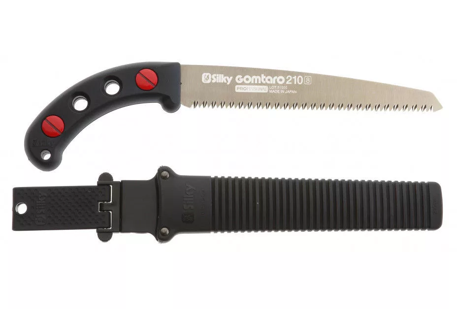 A nagyméretű fogakkal ellátott Gomtaro friss fához alkalmas, és hat késhosszban kapható: 180 - 210 - 240 - 270 - 300 és 330 mm. A finom fogak tapasztalt fához alkalmasak, és négy penge hosszban kaphatók: 240 - 270 - 300 és 330 mm. A hasonló hosszúságú pengék felcserélhetők, így egy többcélú fűrész jön létre. A Gomtaro sorozat minden fűrészéhez könnyű, polipropilén hüvely tartozik, levehető övtartóval. A hüvely két hengerrel van ellátva, hogy az éles fogak ne károsítsák a tokot. Az alsó rész lyukkal van ellátva, amely elvezeti a nedvességet és a fűrészport. A penge hatékonyságának megőrzése érdekében tisztán kell tartani. A gyanta olívaolajban oldódik, amely hatékony és környezetbarát módszer a penge karbantartására. Az agresszívebb folyadékok károsíthatják a fogantyú gumi anyagát. Ha nem használja a fűrészt, ellenőrizze, hogy mindig száraz-e. Tárolja a fűrészt a hüvelyében, száraz helyen. A Gomtaro metszőfűrész elengedhetetlen része a berendezésének, és a felhasználó első választása a formatív metszéshez a fa növekedésének korai éveiben. Az egyenes penge még tisztább és pontosabb vágást ad, mint egy ívelt penge. A sima favágás, amelyet ez a húzófűrész hagy maga után, könnyen megnő. A fa hálás lesz! Az egyenes penge könnyebben kezelhető szűk helyeken és a talaj közelében. A Gomtaro-t szakképzett arboristák körében ajánlják, amikor eltávolítják a fa koronáját. Kivágáshoz az egyenes penge segít a csuklófa kezelésében, miközben megtartja az egyenes hátsó vágást. A famászás fizikai gyakorlása fűrészt igényel, amely megkönnyíti a metszést. Joggal, a szakemberek a Silky-t választják kézifűrészként. A fűrészelés a Gomtaro-val minimális erőfeszítést igényel, és olyan simán megy, hogy felesleges láncfűrészt felgyújtani. Ezenkívül kompakt csere van kéznél, amikor nem áll rendelkezésre láncfűrész, vagy amikor csak egy kezet használhat. A gumiból öntött fogantyú kényelmesen a kézben fekszik és elnyeli a rezgéseket. Rájössz, hogy az alsó kar és a fűrész tökéletesen kiegyensúlyozott. Mászás közben nem mindig mozog a legkényelmesebb helyzetben. Akkor sem hagyja cserben a Gomtaro. A hüvely úgy van kialakítva, hogy minden helyzetben megtartsa a fűrészt, de szükség esetén csak egy kézzel húzhatja ki a fűrészt. Töltse ki Gomtaróját a rendelkezésre álló lábszíjakkal, és a fűrész mindig karnyújtásnyira lesz.
