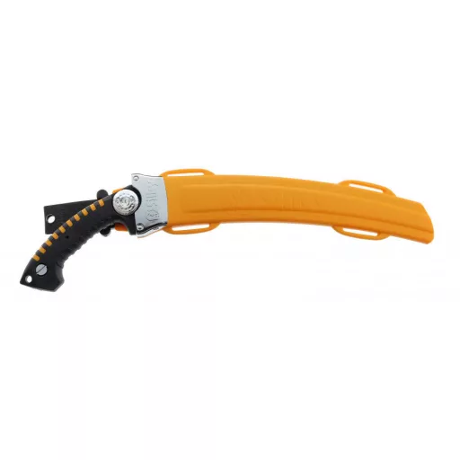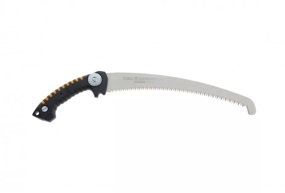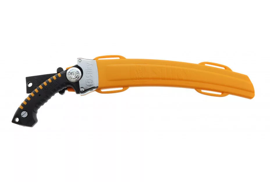 Az Arboristák, akik felfedezték a Sugoi-t, tudatosan döntenek arról, hogy gyakrabban hagyják láncfűrészüket a földön. Miért érdemes nehéz láncfűrészt cipelni, ha a munka ugyanolyan gyorsan és ugyanolyan egyszerűen elvégezhető ezzel az agresszív és erőteljes húzófűrésszel? Biztonságosabban és hatékonyabban dolgozik a Sugoi-val. Az Ön elérhetősége hosszabb, és ez megkönnyíti az extra pár ágak levágását. A penge szélén lévő éles sarlóval gyorsan vághat kisebb gallyakat és borostyánt. Sőt, a sarló segíti a pengét abban, hogy a kanyarban maradjon, így nagyobb irányítást biztosít a fűrészelés közben. A „nagy” feladatok, mint például a fák eltávolítása, nem jelentenek gondot a Sugoi számára. A tökéletesen ívelt penge speciális fémötvözetből készül, amely erősvé, de hajlékonyá teszi a pengét. A Sugoi gyorsan és rázkódás nélkül fűrészel a fán, és sima fakivágást hagy maga után, amely könnyen megnő. A kényelmes, gumival formázott fogantyú elnyeli a rezgéseket és sok tapadást nyújt, még kesztyű viselése esetén, valamint nedves és hideg körülmények között is. A sárga hüvely jól látható, és a mellékelt lábszíjakkal rögzíthető a hámhoz vagy a lábához. Sugoi szó szerint azt jelenti, hogy „kivételesen jó”. Agresszív fogai és a fogantyú narancssárga csíkjai miatt az arboristák ennek a fűrésznek a „Tree tiger” nevet adták. A Sugoi alkalmas friss fa metszésére, de az elhullott ágakat is könnyen kiszedi. Három különböző pengehossz áll rendelkezésre: 330, 360 mm és 420 mm. Mint minden más Selymes fűrésznél, a fogak is sokáig élesek maradnak. Abban az esetben, ha szükségesnek tartják, a Sugoi fogait egy Silky reszelővel lehet reszelni. A Sugoi látható, polipropilén tokkal és két lábszíjjal rendelkezik. A hüvelynek levehető övtartója és belső hengerei vannak, hogy megakadályozzák a fogak károsítását a tokban. Az alsó rész lyukkal van ellátva, amely nedves és fűrészport ürít. A penge hatékonyságának megőrzése érdekében tisztán kell tartani. A gyanta olívaolajban oldódik, amely hatékony és környezetbarát módszer a penge fenntartására. Az agresszívebb folyadékok károsíthatják a fogantyú gumit. Ha nem használja a fűrészt, ellenőrizze, hogy mindig száraz-e. Tárolja a fűrészt a hüvelyében, száraz helyen.