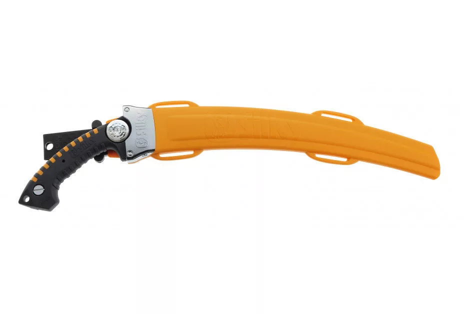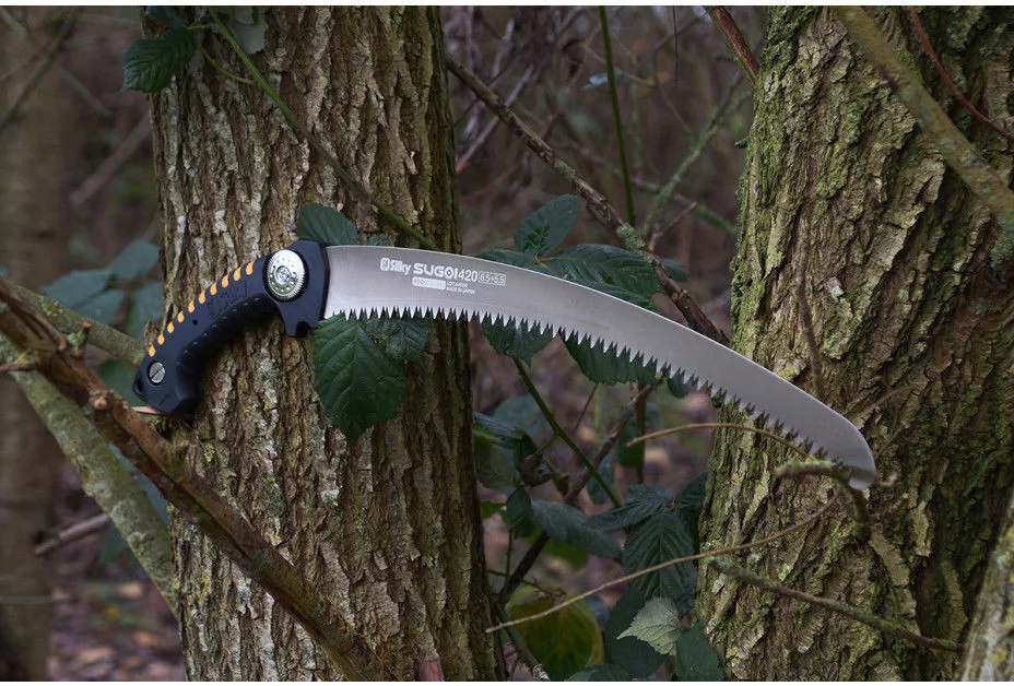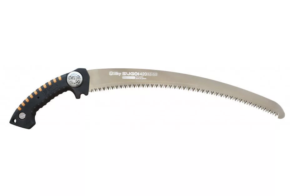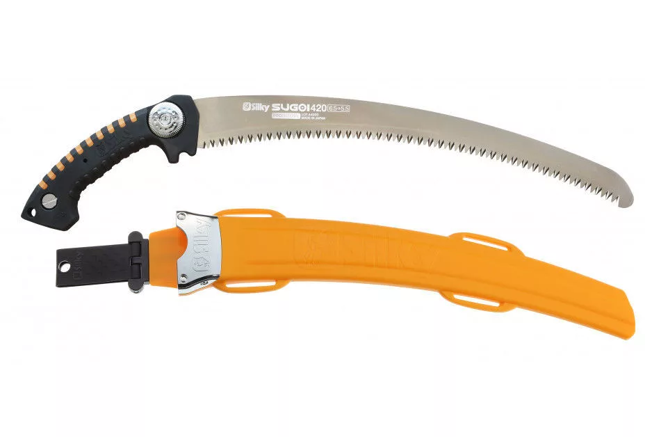 A Sugoi alkalmas friss fa metszésére, de az elhullott ágakat is könnyedén veszi. Három különböző pengehossz áll rendelkezésre: 330, 360 mm és 420 mm. Mint minden más selymes fűrésznél, a fogak is sokáig élesek maradnak. Abban az esetben, ha szükségesnek tartják, a Sugoi fogait egy Silky reszelővel lehet reszelni. A Sugoi látható, polipropilén tokkal és két lábszíjjal rendelkezik. A hüvelynek levehető övtartója és belső hengerei vannak, hogy megakadályozzák a fogak károsodását a tokban. Az alsó rész lyukkal van ellátva, amely elvezeti a nedvességet és a fűrészport. Az Arboristák, akik felfedezték a Sugoi-t, tudatosan döntenek arról, hogy gyakrabban hagyják láncfűrészüket a földön. Miért viseljen nehéz láncfűrészt, ha a munka ugyanolyan gyorsan és ugyanolyan egyszerűen elvégezhető ezzel az agresszív és erőteljes húzófűrésszel? Biztonságosabban és hatékonyabban dolgozik a Sugoi-val. Az Ön hatóköre hosszabb, és ez megkönnyíti az extra pár ágak levágását. A „nagy” feladatok, mint például a fák eltávolítása, nem jelentenek problémát a Sugoi számára. A tökéletesen ívelt penge speciális fémötvözetből készül, amely erősvé, de hajlékonyá teszi a pengét. A Sugoi gyorsan és rázkódás nélkül fűrészel a fán, és sima fakivágást hagy maga után, amely könnyen megnő. A kényelmes, gumival formázott fogantyú elnyeli a rezgéseket és sok tapadást nyújt még kesztyű viselése esetén, valamint nedves és hideg körülmények között is. A sárga hüvely jól látható, és a mellékelt lábszíjakkal rögzíthető a hámhoz vagy a lábához. Sugoi szó szerint azt jelenti, hogy „kivételesen jó”. Az agresszív fogak és a fogantyú narancssárga csíkjai miatt az arboristák ezt a fűrészt a „Tree tiger” névre keresztelték. A penge hatékonyságának megőrzése érdekében tisztán kell tartani. A gyanta olívaolajban oldódik, amely hatékony és környezetbarát módszer a penge karbantartására. Az agresszívebb folyadékok károsíthatják a fogantyú gumi anyagát. Ha nem használja a fűrészt, ellenőrizze, hogy mindig száraz-e. Tárolja a fűrészt a hüvelyében, száraz helyen.