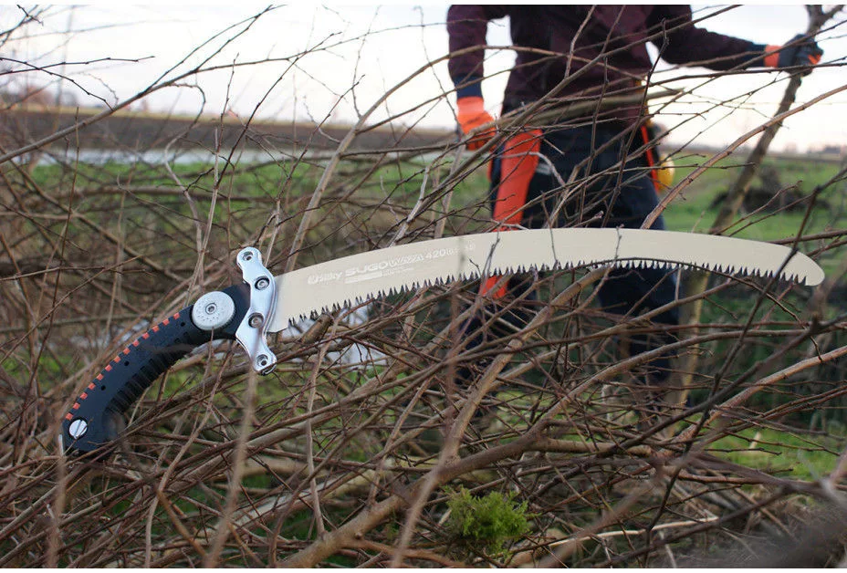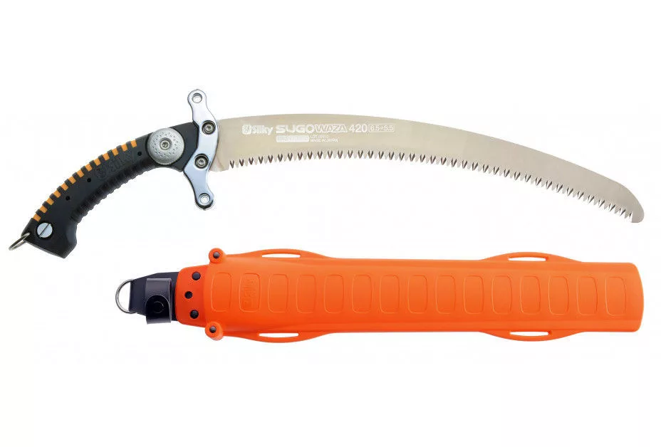 A Sugowazát elsősorban gumiszigetelt kesztyűt viselő munkavállalók számára tervezték. A Sugoi összes jellemzője mellett ez a húzófűrész egy extra keresztvédővel rendelkezik, amely megakadályozza, hogy a felhasználók kesztyűs keze lecsússzon a fogantyúról. Nem sokkal bevezetése után a Sugowazát felfedezték más felhasználók, akik nedves és hideg körülmények között is dolgoztak. Még akkor is, ha a kesztyű viselése elengedhetetlenné vált, a csúszásgátlónak köszönhetően a legnagyobb biztonságot nyújtja. A kényelmes gumifogantyú sok tapadást nyújt, elnyeli a rezgéseket és mindig melegnek érzi az érintését. A fogantyú D-gyűrűjével tovább rögzítheti a fűrészt. A Sugowaza segítségével nemcsak biztonságosan, hanem hatékonyan is dolgozik. A hosszú, 420 mm-es penge tovább nyúl, és megkönnyíti az extra pár ágak levágását. A „nagy” feladatok, például a fák eltávolítása vagy a nagyobb végtagok fűrészelése nem jelent semmiféle problémát a Sugowaza számára. A tökéletesen ívelt penge speciális fémötvözetből készül, amely erősvé, de hajlékonyá teszi a pengét. A Sugowaza gyorsan és rázkódás nélkül fűrészel a fán, és sima vágást hagy maga után, amely könnyen kinő. A narancssárga hüvely jól látható, és rögzíthető a hámhoz. Töltse ki a Sugowazát a rendelkezésre álló lábszíjakkal, és a fűrész mindig karnyújtásnyira lesz. Szó szerint a Sugowaza „nagyon magas szintű kézművességet” jelent. A Sugowaza alkalmas friss fa metszésére, de az elhullott ágakat is könnyen kiszedi. Mint minden Silky fűrésznél, a fogak is sokáig élesek maradnak. Ha szükségesnek tartják, a Sugowaza fogai újjáélesedhetnek a Silk reszelővel. A Sugowaza élénk színű, polipropilén tokkal rendelkezik. A hüvelynek van egy kapcsos övtartója, így a fűrész nem eshet ki. Belül a hüvely két hengerrel rendelkezik, hogy megakadályozzák a fogak károsítását a tokban. Az alsó rész lyukkal van ellátva, amely elvezeti a nedvességet és a fűrészport.
