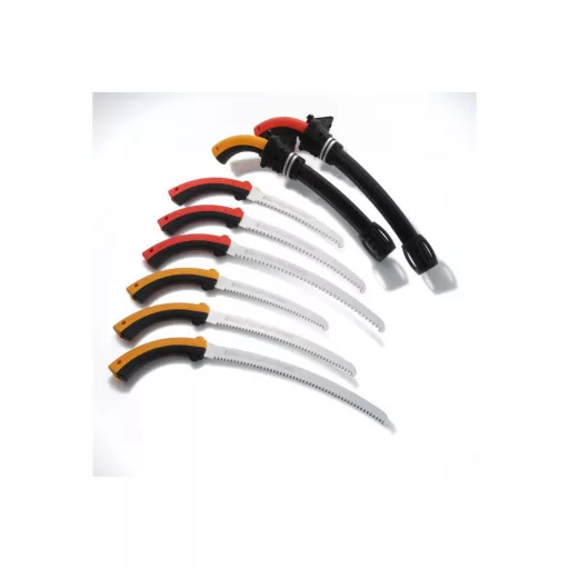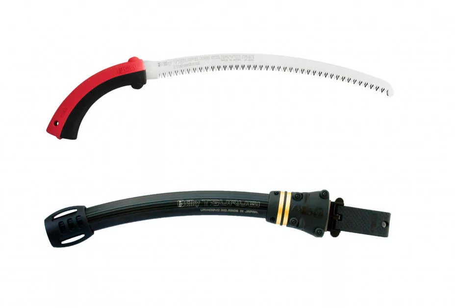 Új Tsurugi modell ívelt pengével a még jobb vágási teljesítmény érdekében. A penge nagyon kicsi szélessége miatt a fűrész alkalmas a sűrű növényzetű helyeken történő metszésre. A gumifogantyú két részből áll, és csavarok nélkül könnyen szétszerelhető. A fűrészt alumínium tokkal van ellátva, amelynek biztonsági vezetőgörgői megakadályozzák a penge sérülését vagy tompulását, ha kihúzzák vagy behelyezik a házba.